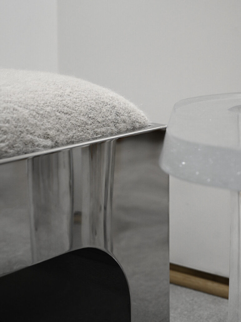 Polished Stainless Steel Upholstered in Pierre Frey – Yeti Quinoa.