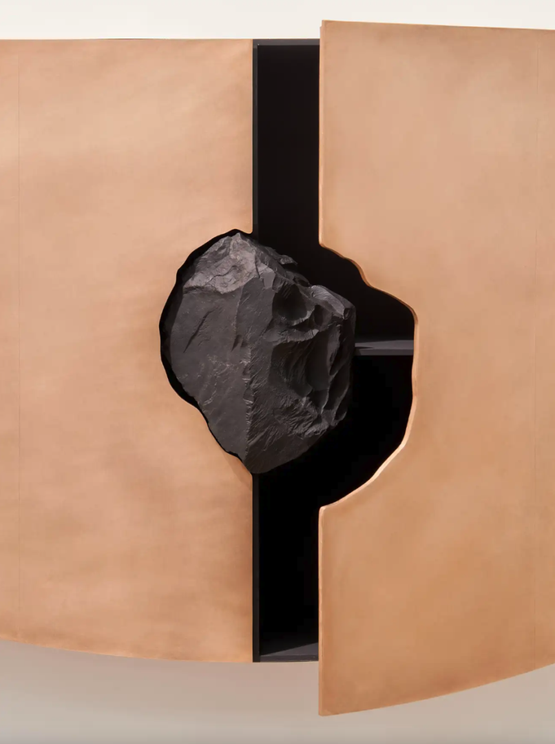 Mid-butterfly hinged doors sits an unpolished Noir Belge stone fragment, estimated some 280 million years old and found in the Golzinne mines in Gembloux, Belgium.