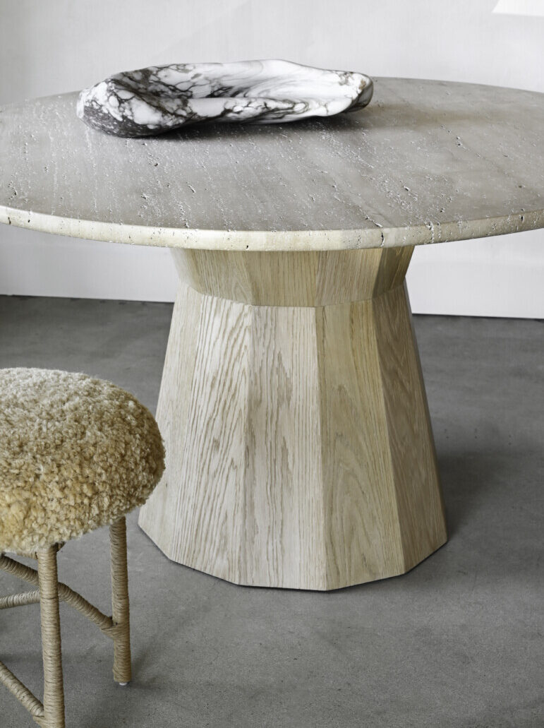 An original Stahl + Band designed dining table. Featuring a multi-faceted pedestal base with a solid Stone Top.
