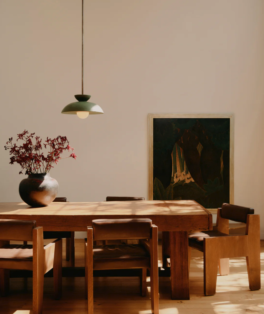 A foundational piece whose unique form—which couples flat, slab-built faces with hand-thrown curves—inspired the Terra series’ sculptural silhouettes. Its clay body is suspended from a brass rod with a self-leveling canopy, appearing at once sturdy and light as air. Collaboration between Danny Kaplan and ICW.