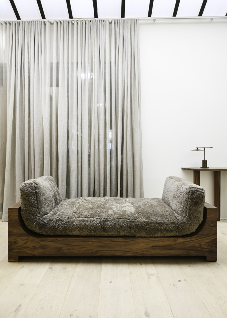An original Stahl + Band designed chaise derived from the Frank sofa. Bespoke design meets the practicality of materials from the 70’s . . . a bench seat and pillow back are full of feathers and down comfort.